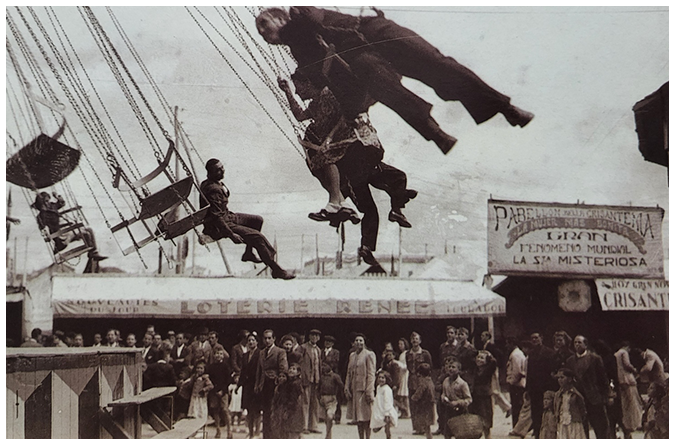 Al fondo, las barracas de la misma calle, anunciando «La Bella Crisantema (gran fenómeno mundial, la señorita misteriosa) y la «Lotería Renée».