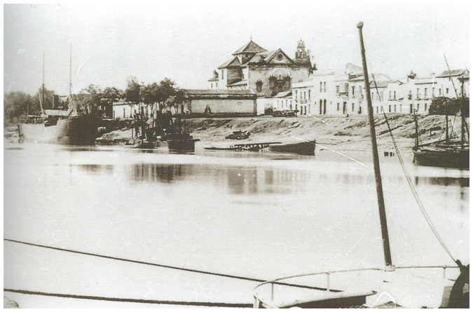 Entre las vistas que nos legó el francés Hubert de Vaffier cuando visita Sevilla en 1889, figuran el Palacio de San Telmo, el Palacio Arzobispal, las murallas, la Plaza Nueva y una hermosa panorámica del río.