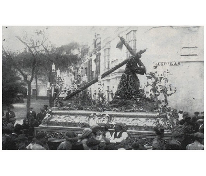 La primera fotografía corresponde a los años 1920, pues en esos años procesionaban con las andas que habían comprado a la Hermandad de Pasión (y que costaron 1000 ptas), y hasta 1926 no se incorpora la figura del Cirineo.