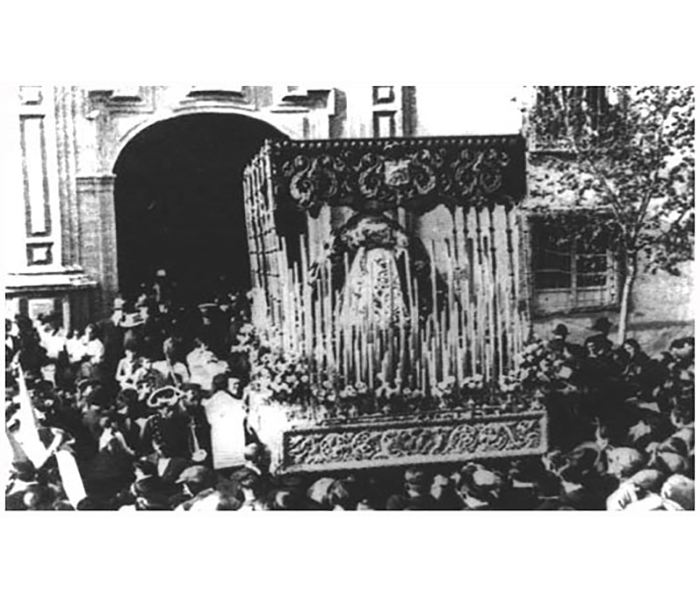 En la segunda imágen podemos ver una fotografía que corresponde tambien a los años 20, procesionando con la Virgen de Gracia y Esperanza que estaba atribuida a Blas Molner, y que se perdió en el incendio provocado de 1936, así como el palio que vemos en la foto.