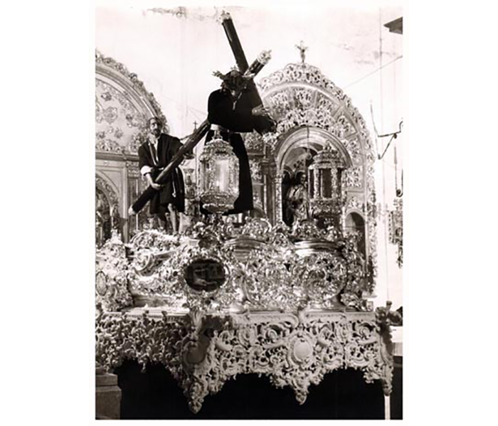 La tercera imágen, nos muestra una fotografía inédita del año 1963. Prueba de la posible iluminación con faroles, en sustitución de los candelabros, con los faroles de la Hermandad del Gran Poder (Véanse los faroles delante y los candelabros detrás). Figura del Cirineo, recién finalizada por el escultor Don Antonio Illanes Rodríguez (1963). Nuevos respiraderos (aún sin dorar), obra de Don Manuel Guzmán Bejarano.